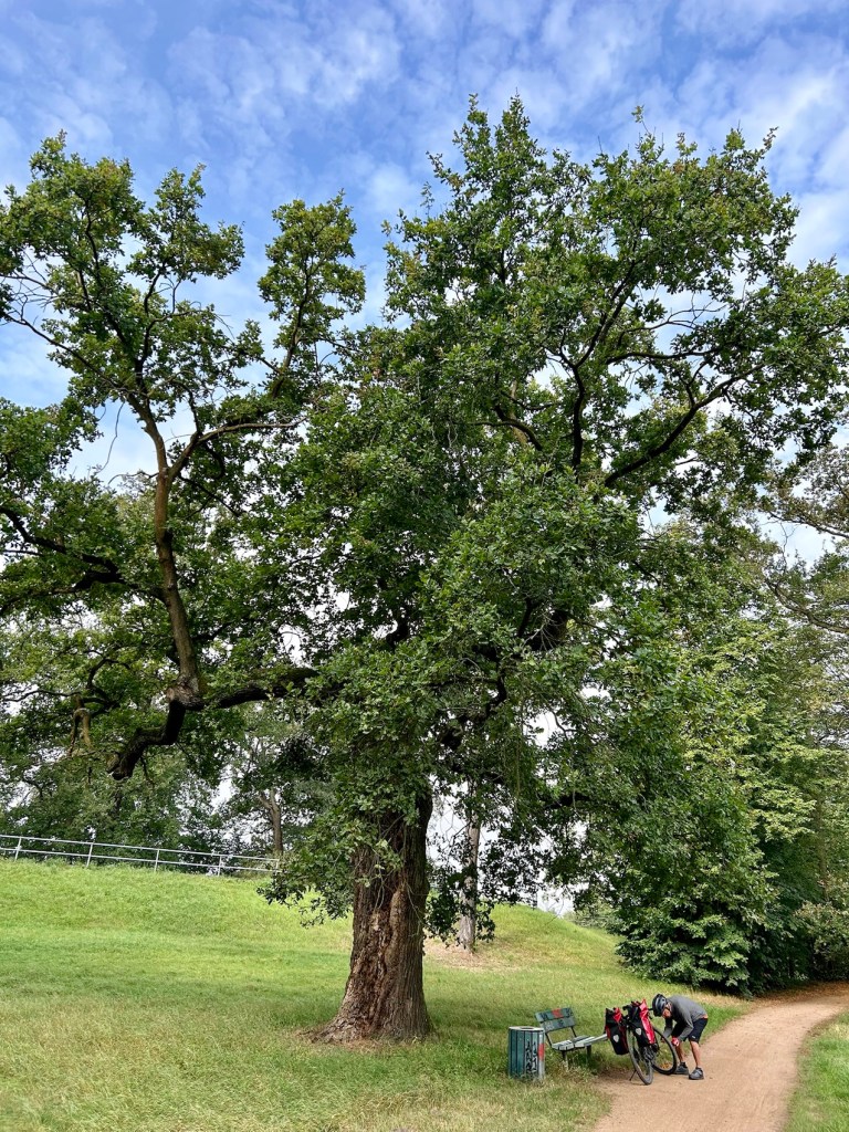 Pneu d’Yves beaucoup dégonflé, il a tout ce qu’il faut. Le parc que nous traversons est magnifique avec d’immenses arbres.