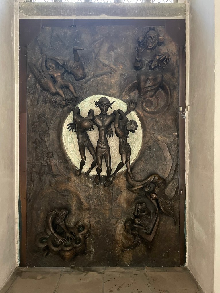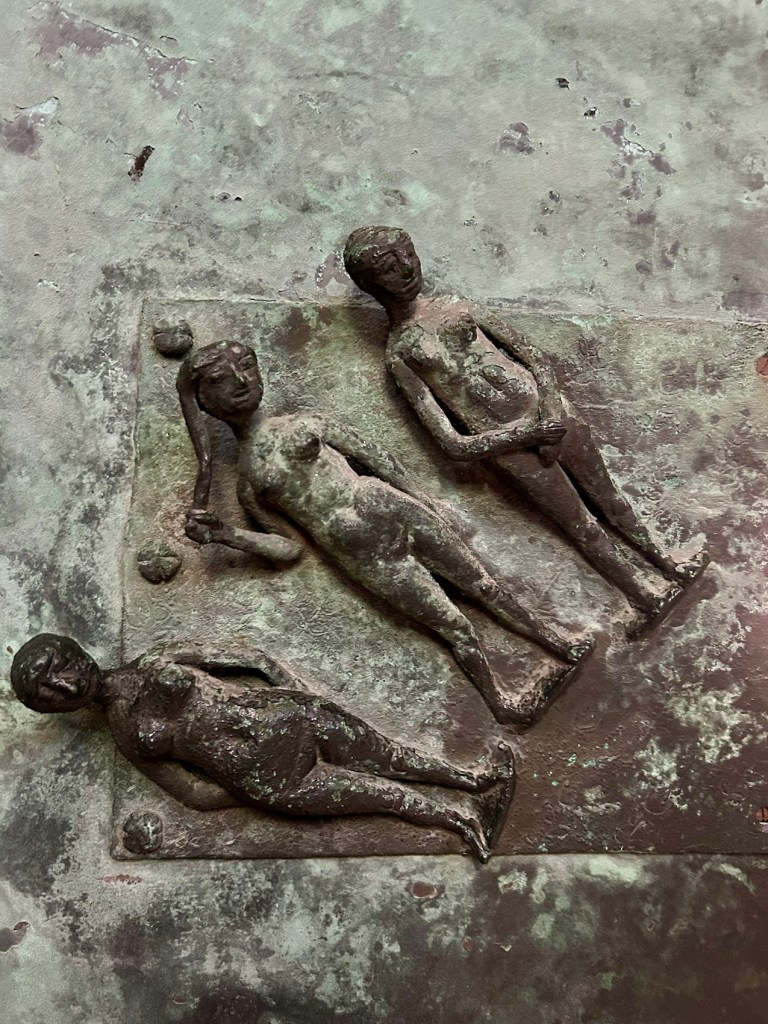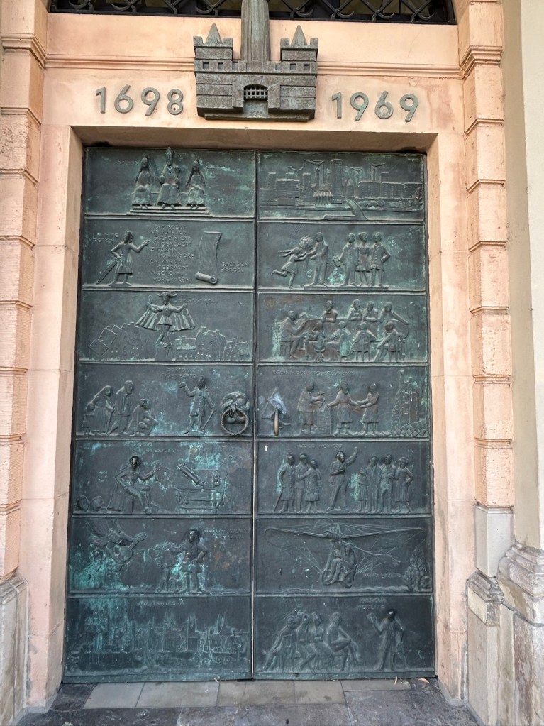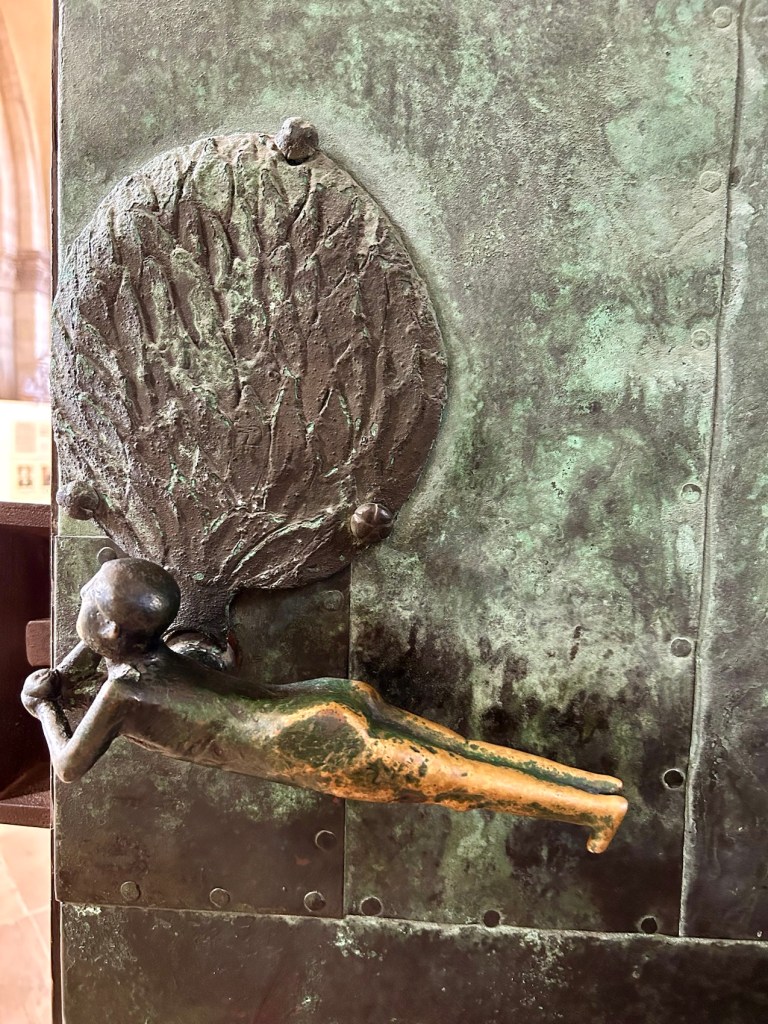 Fermeture d’une lourde porte en bronze. Un côté.