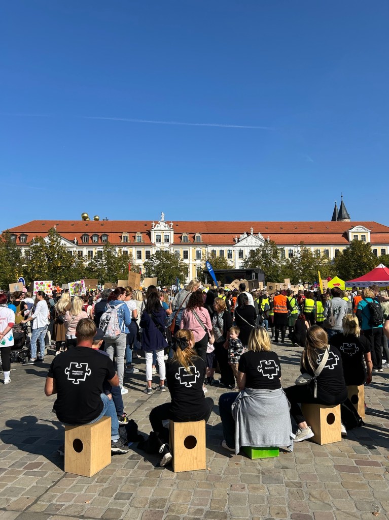 Manifestation d’enseignants de maternelle sur la place de la cathédrale.