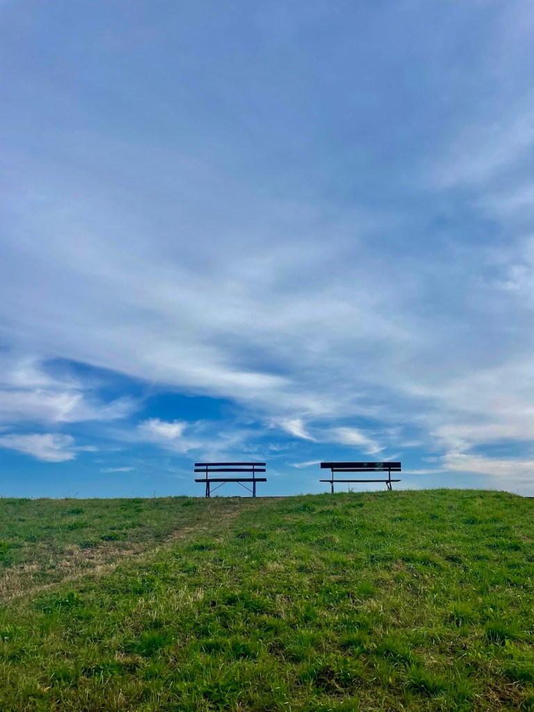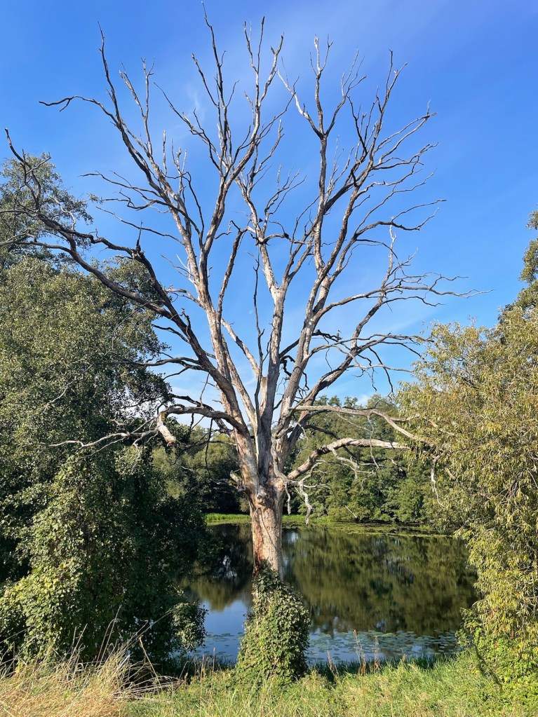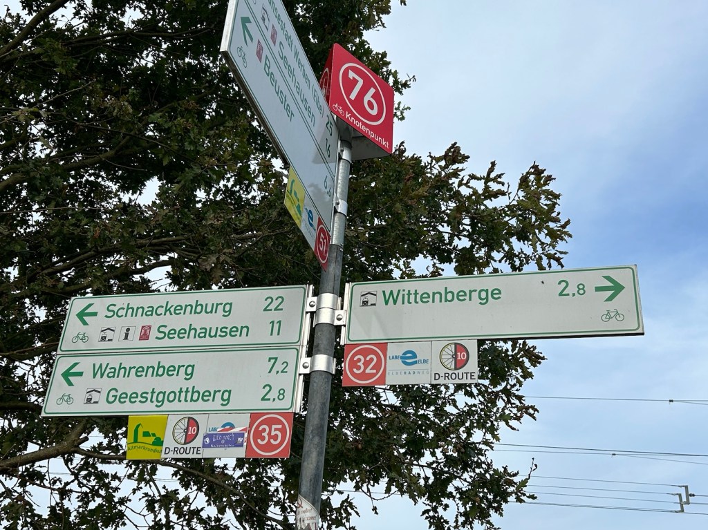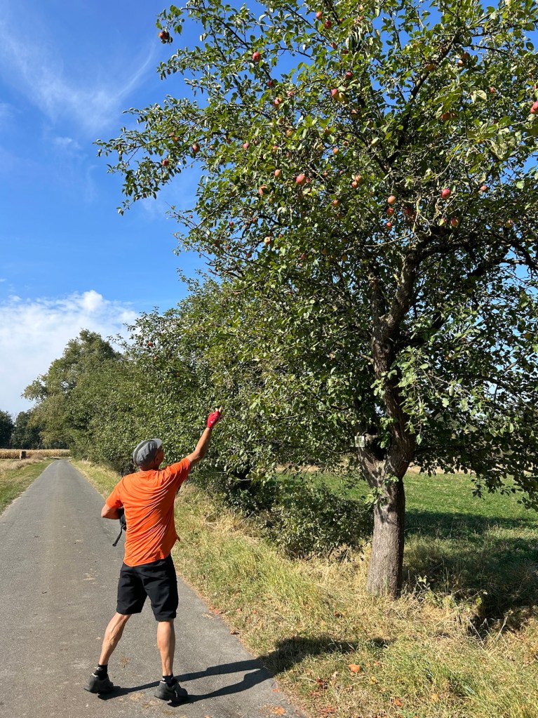 La route est bordée de pommiers remplis de pommes, évidemment plus à notre portée. Yves essaye de les déquiller d’abord avec son casque qui manque de rester accroché dans l’arbre, ensuite avec les pommes abîmées qui sont par terre. Résultat, je repars avec deux pommes.