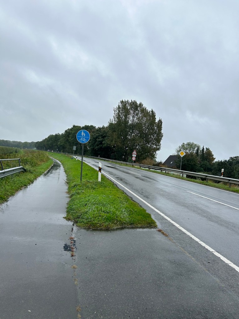 Lorsque nous sommes sur une route à grande circulation nous roulons sur ce genre de piste. Il y en a partout le long des routes. Et chaque fois je pense à notre Chemin des Canaux qu’on nous a re goudronné récemment en réduisant la bande roulante ainsi que les bas côtés. Pour arriver au fossé on a rajouté des graviers. Maintenant lorsque je roule en vélo sur le Chemin des Canaux, j’ai peur.