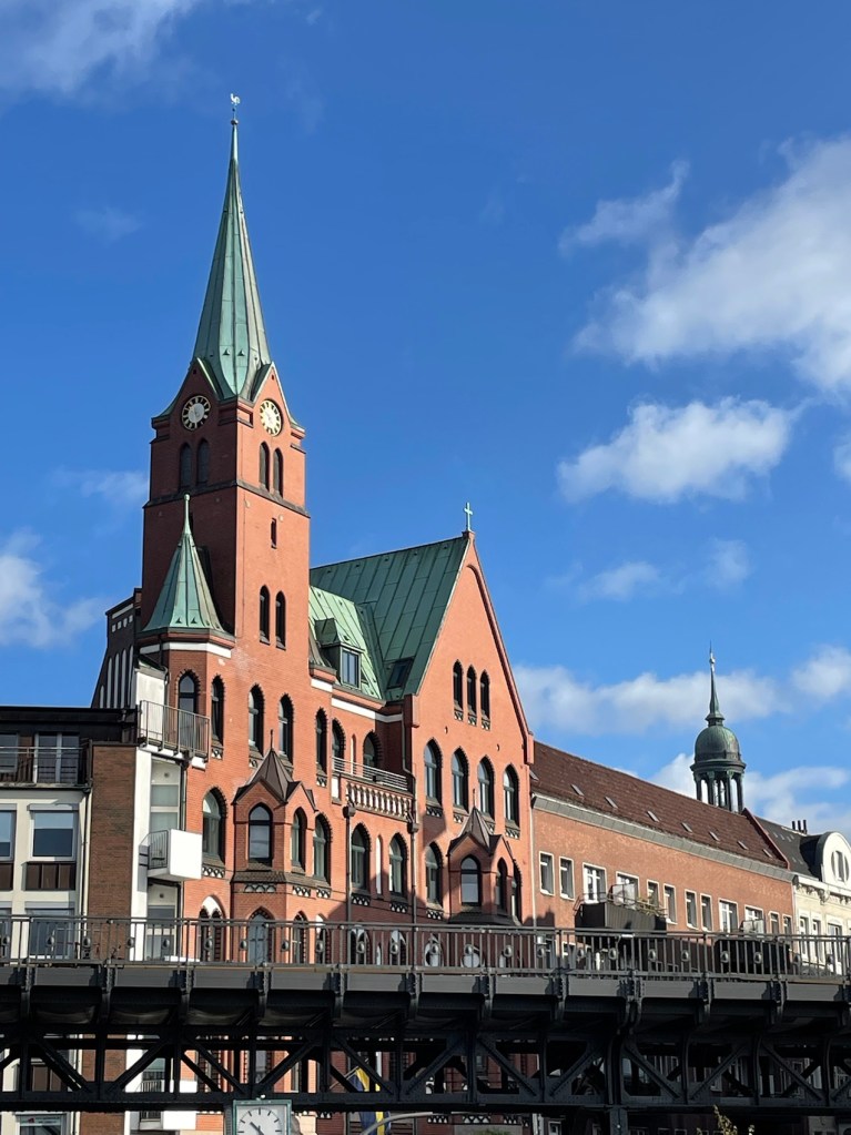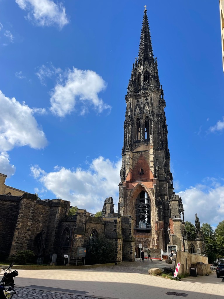 Mémorial Saint Nicolas. L’église a été détruite pendant la guerre et lors de la reconstruction il fut décidé de garder les ruines et la tour comme lieu de mémoire. Lors de sa consécration en 1863, elle était considérée comme la plus importante église néo-gothique. Culminant à 147,3 m sa tour était le plus haut édifice sacré du monde.