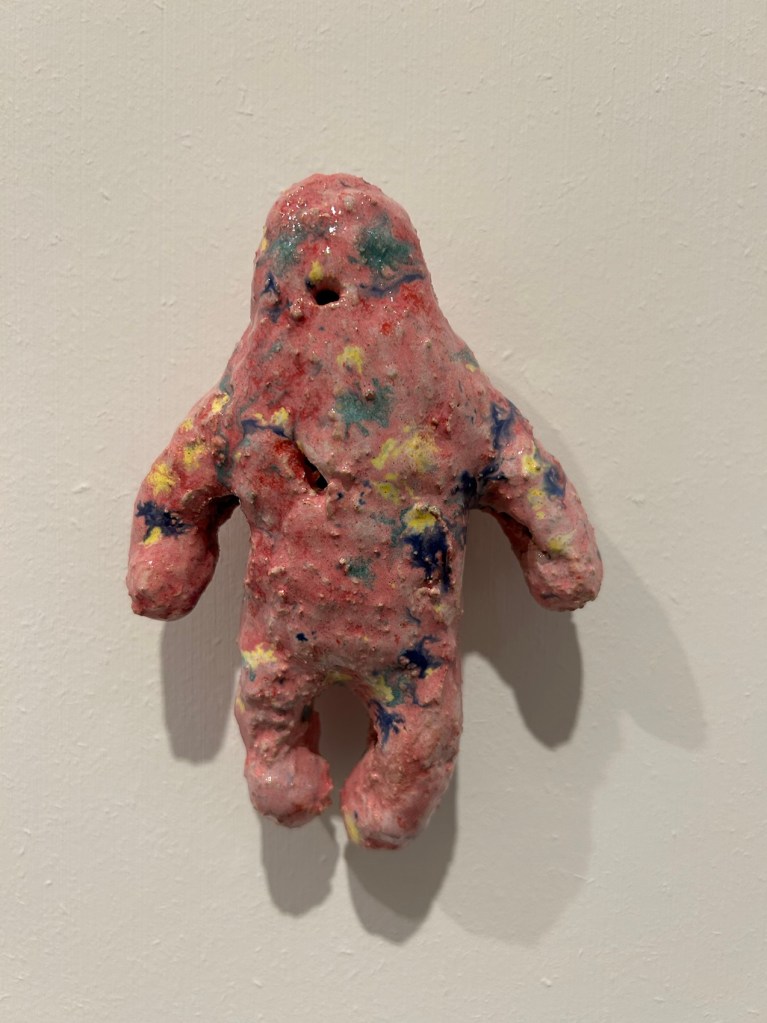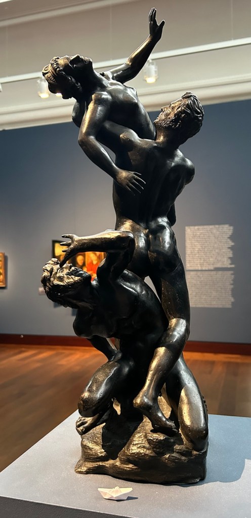 Elle a un petit bateau posé sur ses mains. J’ai croisé trois petits qui essayaient de mettre des papiers sur les tableaux, ils ont réussi sur les sculptures.