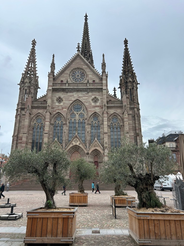 Mulhouse. Temple Saint-Etienne. Un petit air du midi sur la place de la Réunion.