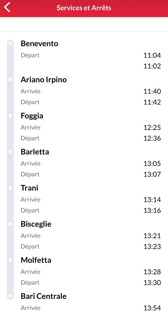 Ce matin nous avons pris le train pour aller à Bari. Il nous fallait traverser les Apennins pour aller dans les Pouilles et ça risquait d’être très difficile pour nous. Nous avons fui le dénivelé et le mauvais temps qui était annoncé pour le lendemain.