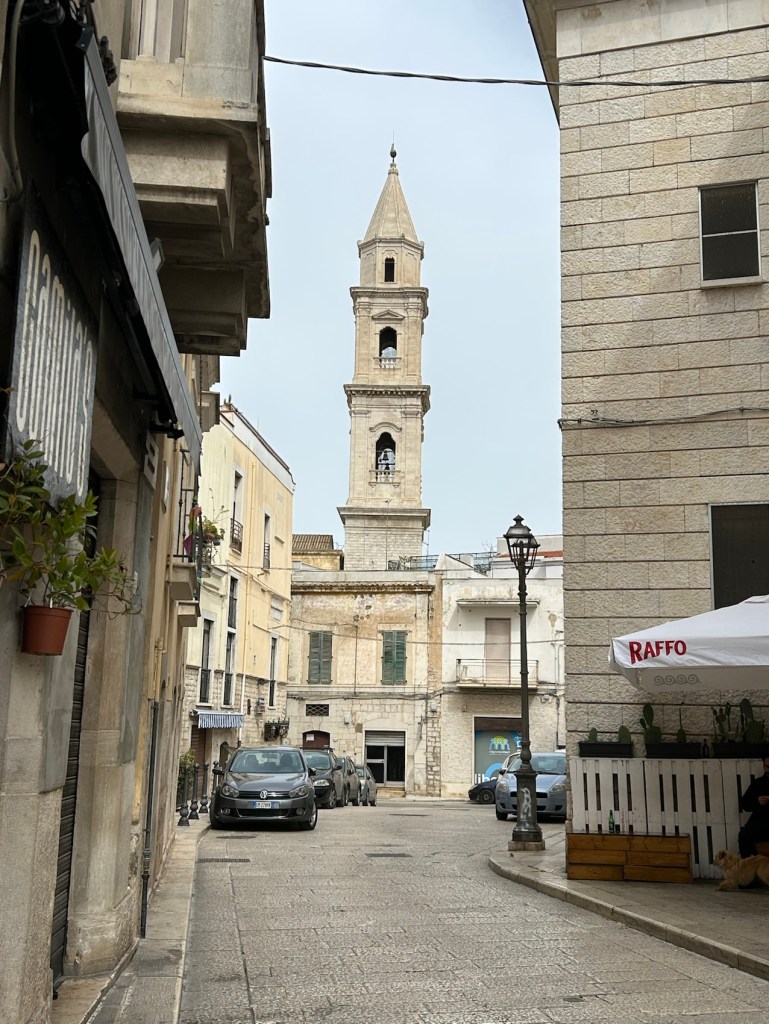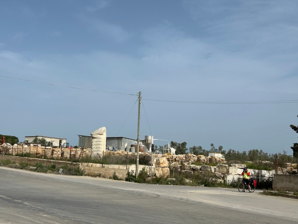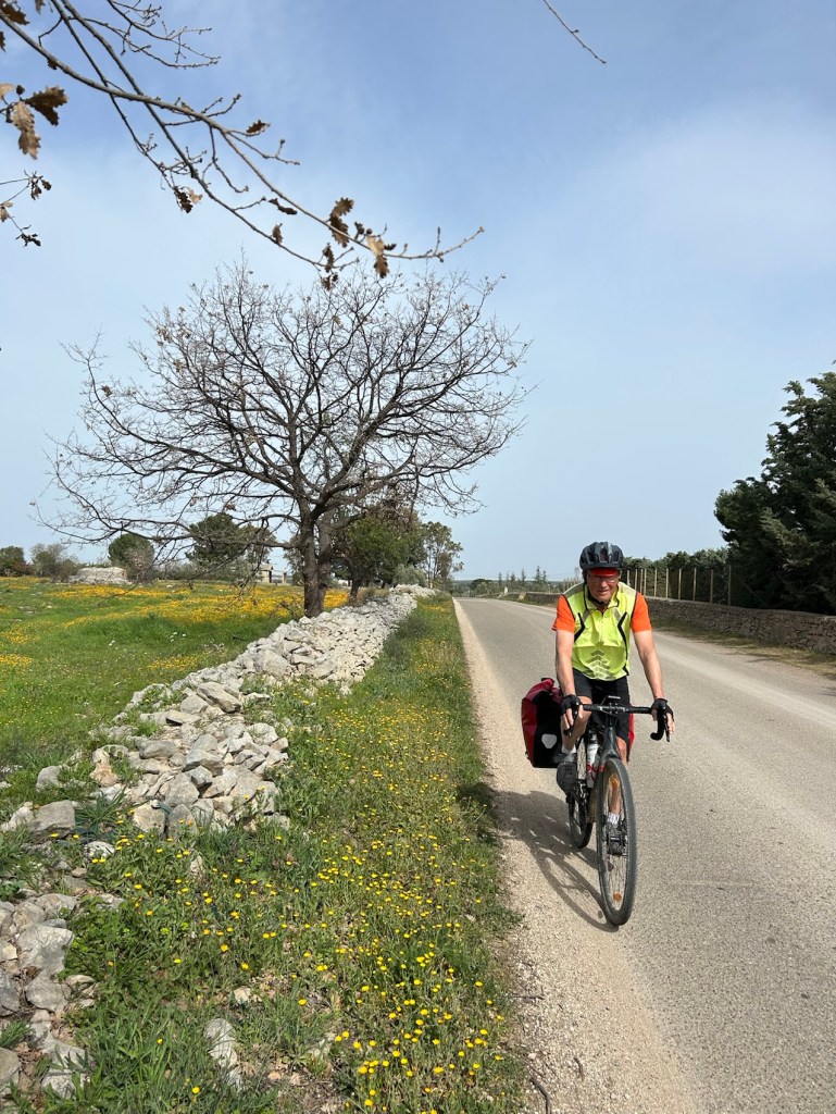 Cette rue ne traduit pas la difficulté que j’ai eu pour traverser Andria une ville de presque 100 000 habitants. Des voitures, des camions, des bus, des feux rouges, des gens dans les rues, des voitures garées n’importe comment, des voitures qui reculent en pleine rue, vivement les petites routes !!! Et heureusement les enfants étaient à l’école !!!