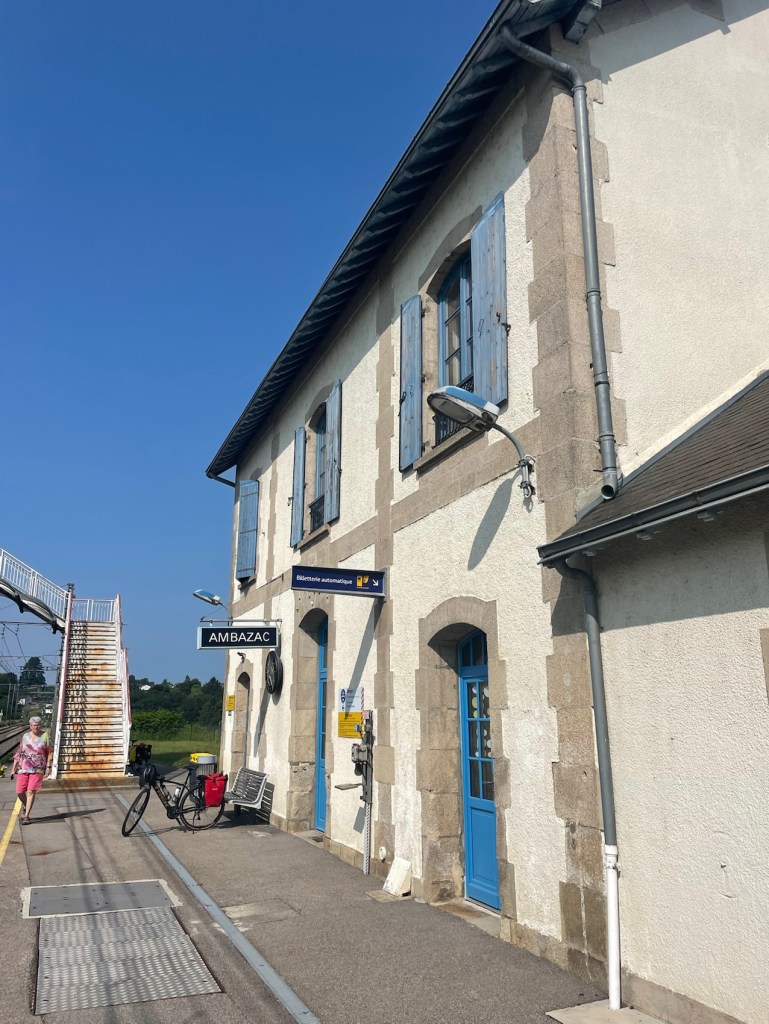 La gare d’Ambazac. Un quai qui va vers Limoges, un quai qui va vers Montluçon. Heureusement, nous sommes du bon côté sinon il nous aurait fallu prendre l’escalier pour passer de l’autre côté. Vergèze est mieux aménagé, il y a un plan incliné et un tunnel pour passer de l’autre côté.