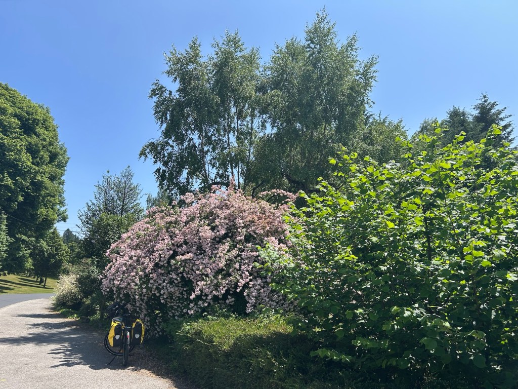 A fait boum !!! Ma béquille est trop longue… vélo trop chargé, je venais d’ouvrir les sacoches pour sortir une partie du piquenique…