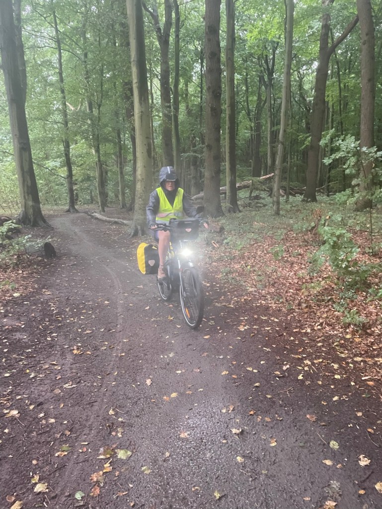 Comme le temps semble s’être levé, nous reprenons la route. Le vélo d’Yves qui n’a pas de garde-boue !!! Et c’est pareil sur son short et sa veste de pluie.