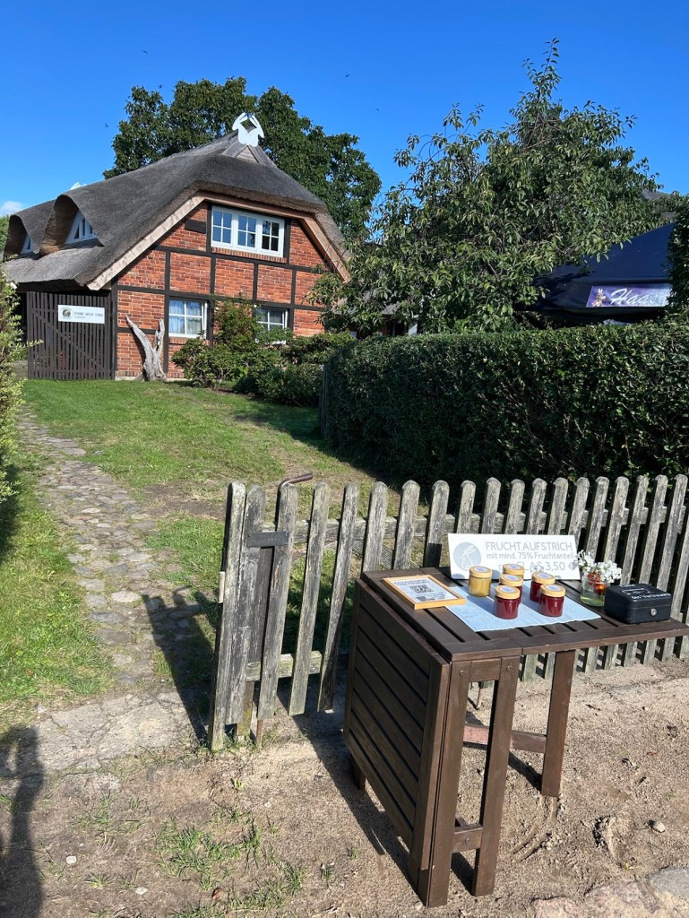 Gross Stresow. Succession de maisons au bord de l’eau. Et comme devant de nombreuses maisons, vente au bord de la route.