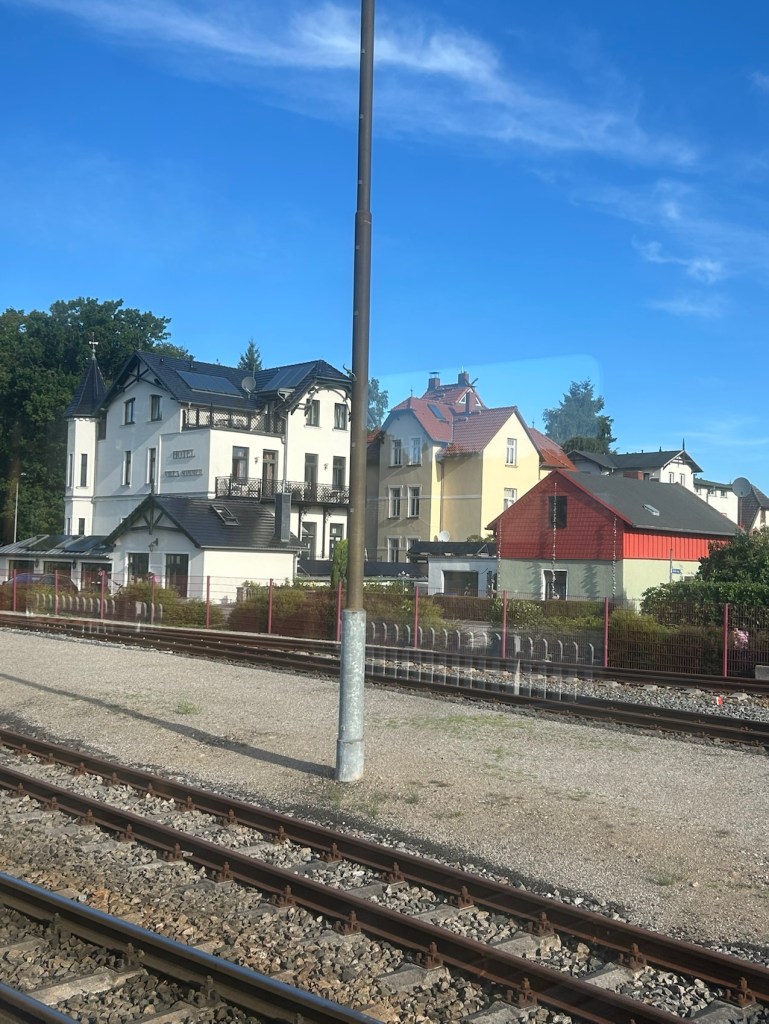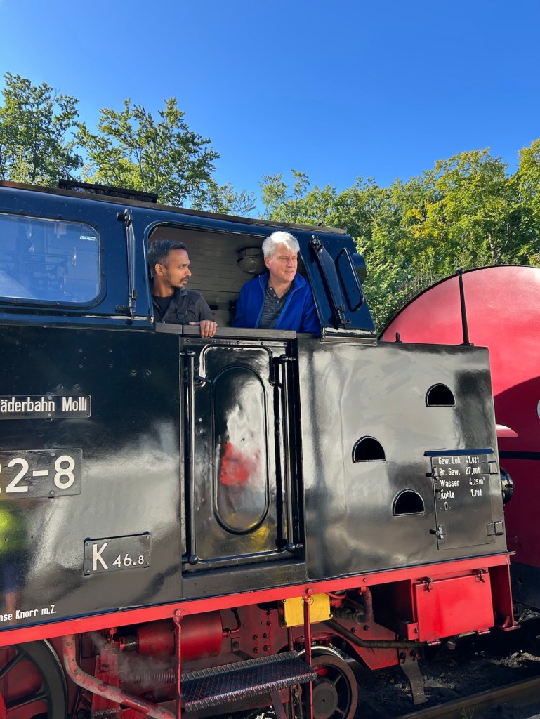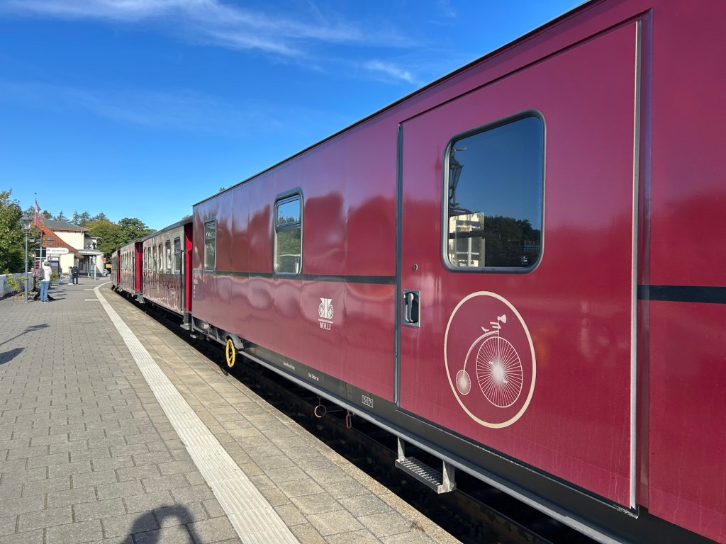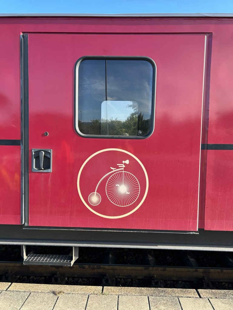 Nous commençons la journée par une petite promenade en train, c’est tellement chouette de traverser la ville dans ce magnifique train. Wagon spécial vélo avec un gentil monsieur qui est là spécialement pour hisser nos vélos et les attacher une fois à l’intérieur.