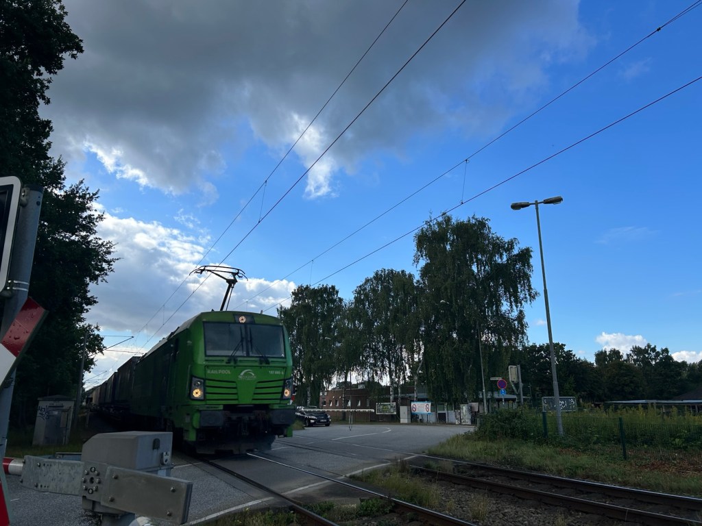 Passage à niveau fermé. Train de marchandises chargé de remorques de camions.