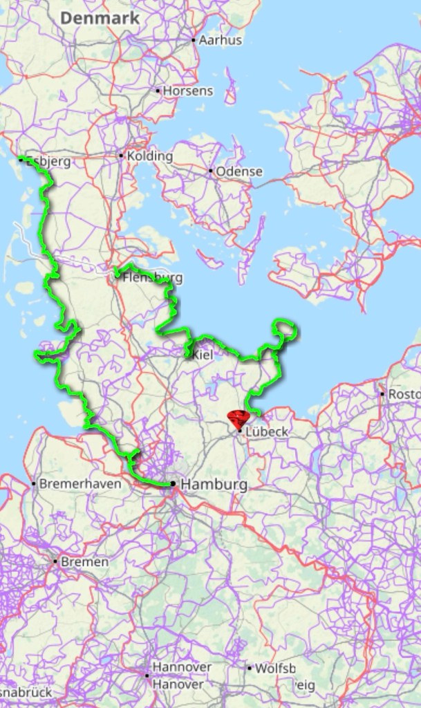 Nous sommes à la petite toupie rouge, nous allons remonter jusqu’à la frontière danoise à Kolding, il me manque la trace, traverser le long de la frontière jusqu’à Esbjerg et redescendre jusqu’à Hambourg, le long de la trace verte… il faut que nous soyons fous, environ encore 700 km à faire !!!
