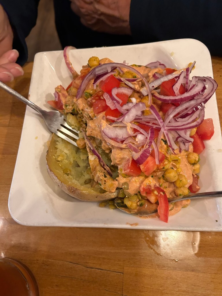 Base : une énorme pomme de terre au four, ouverte, écrasée et garnie… concept sympa et c’est bien bon.