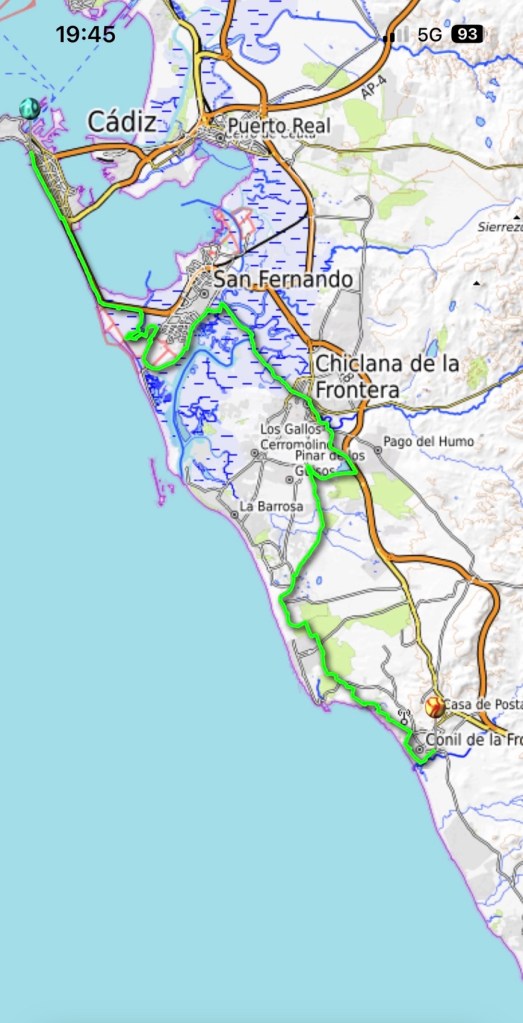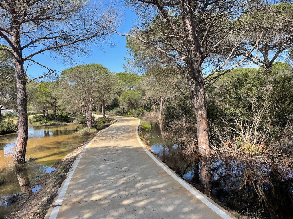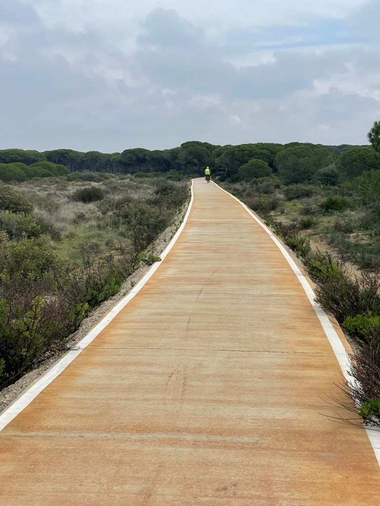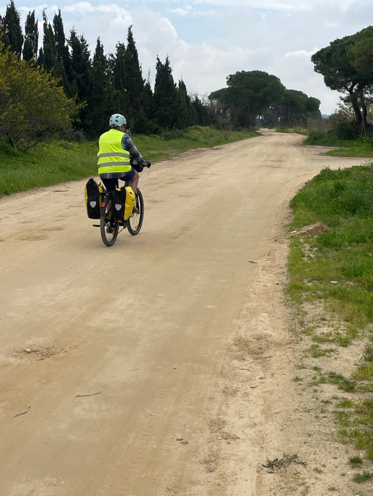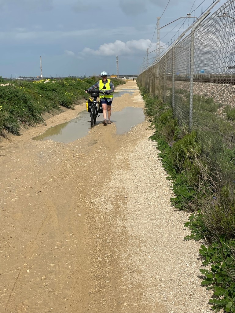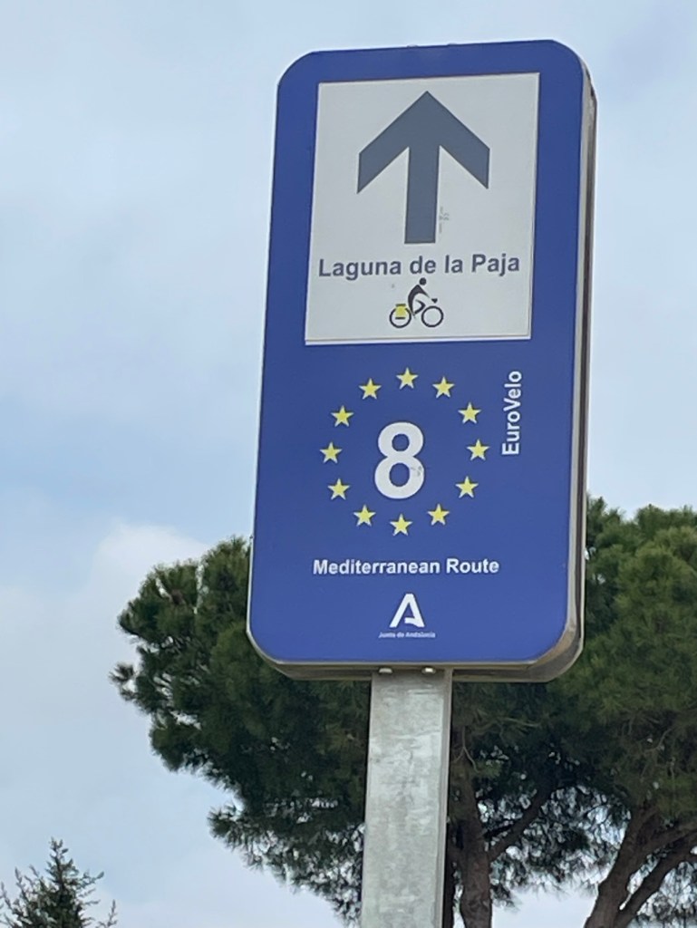 Nous trouvons enfin des panneaux indicateurs. Nous allons pédaler le long de l’EuroVelo 8 qui débute à Cádiz et va jusqu’à Athènes en Grèce et ensuite à Chypre en longeant l’a Mediterranée.
