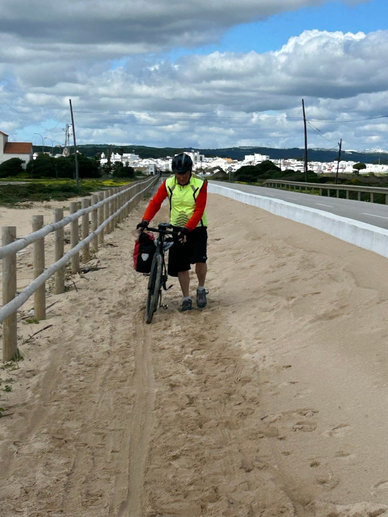 Je l’attendais avec impatience, il a posé pied à terre plus tard que moi, mais impossible de pédaler, trop de sable sur la piste cyclable.