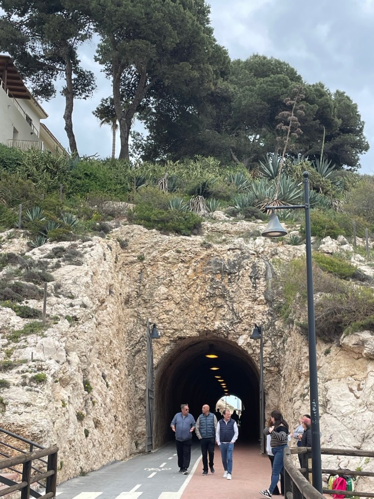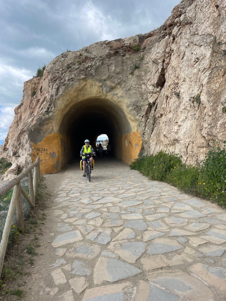 Un tunnel, il va y en avoir de nombreux que je ne verrai pas, car j’ai raté la piste qui longe la mer. La localisation sur Iphigénie ne fonctionnait pas à cause de la batterie déchargée et je ne savais pas où j’étais. J’ai continué sur la route et retrouvé Yves quelques kilomètres plus loin.