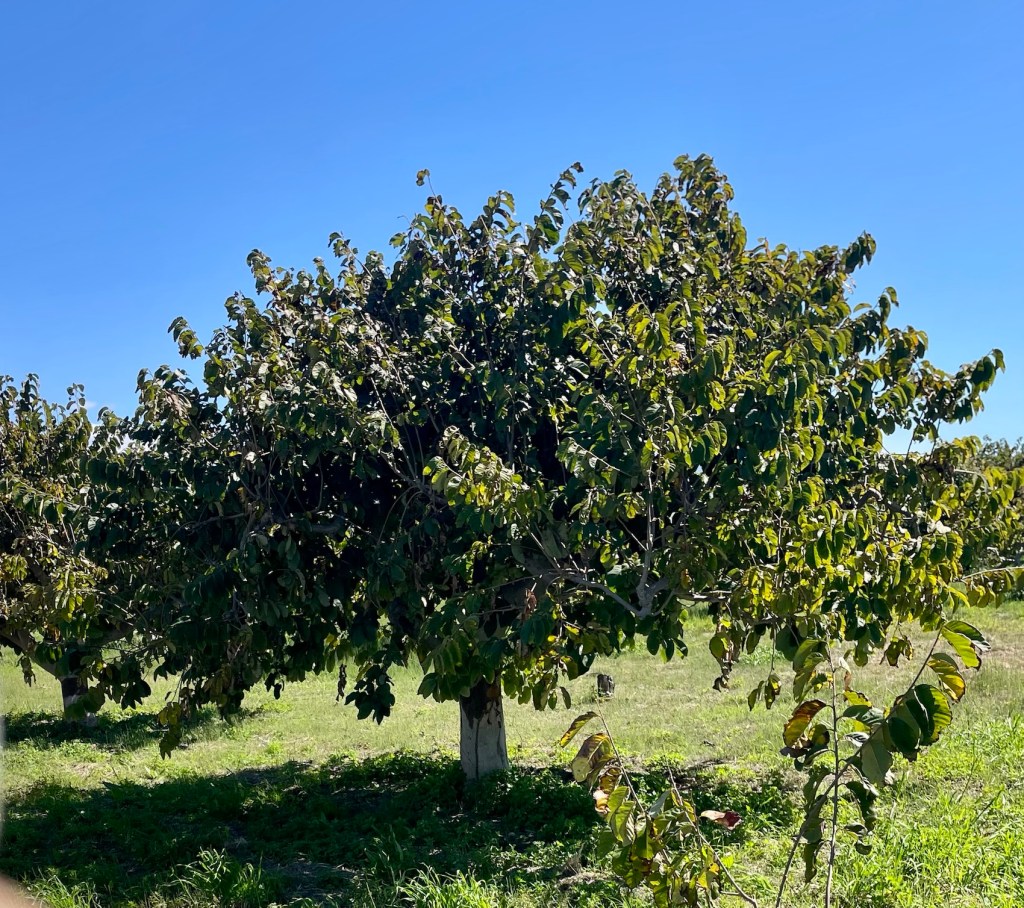 Nous circulons au milieu de champs clôturés, plantés de fruits exotiques.