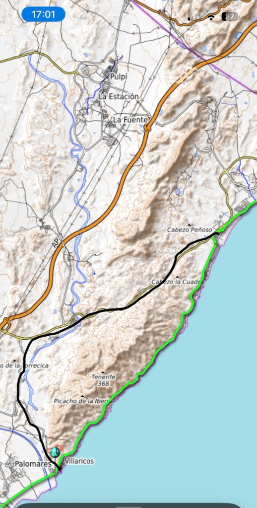 Notre parcours est la trace verte au bord de l’eau, mais, il y a toujours un mais, la route est barrée à la sortie de Villaricos… et nous voilà partis sur le trait noir, c’est plus long…