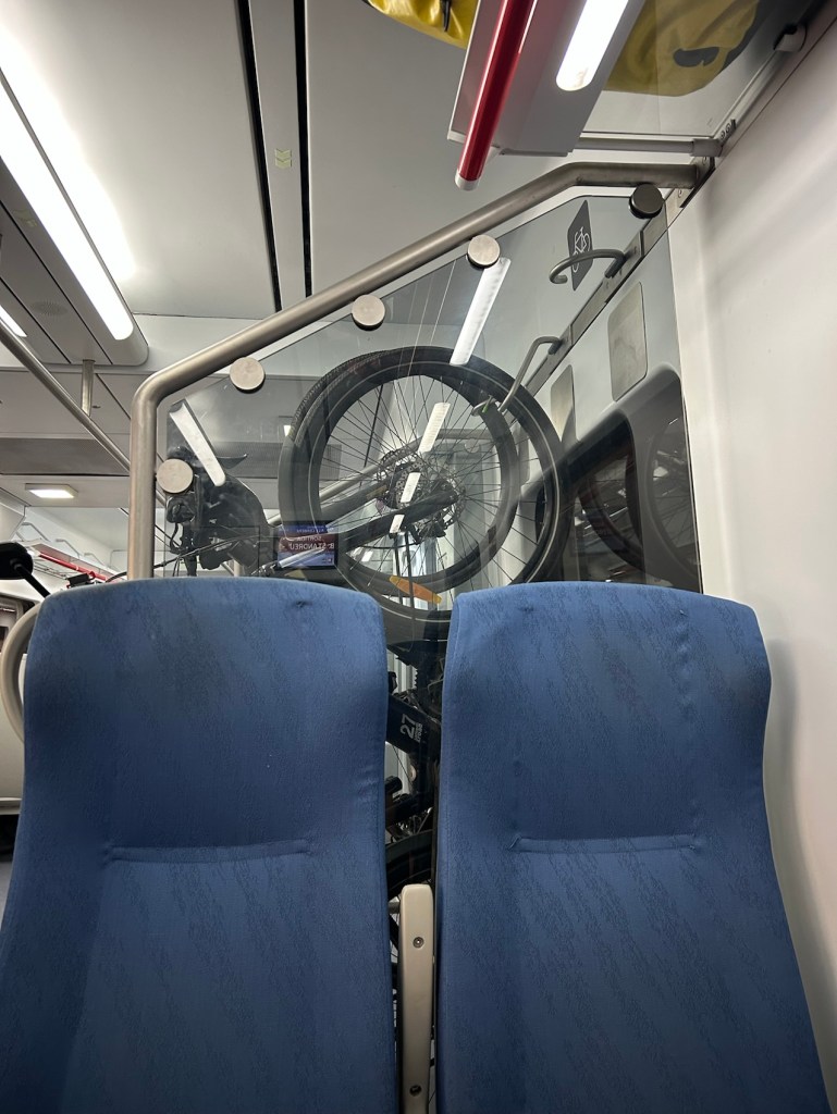 Tarragone – Sant Vicenç de Calders dans un train bondé, heureusement les gens sont très gentils et ils nous ont aidés à accrocher les vélos.