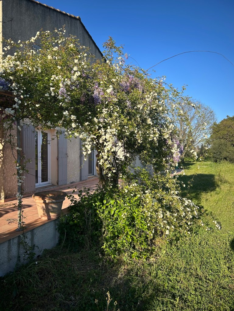 Chouette, la maison !!! Le rosier de Banks et la glycine sont pleins de fleurs.